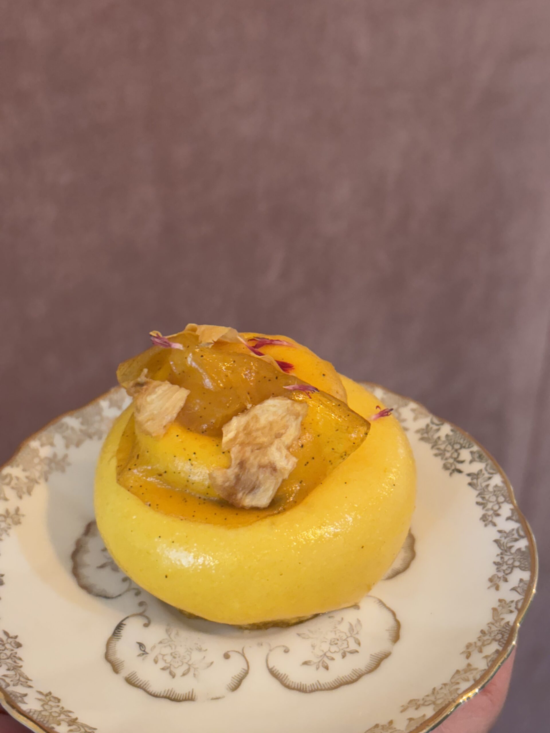 Sablé feuillantine coco, biscuit moelleux coco, mousse coco, confit ananas rhum passion et voil de passion (vegan)